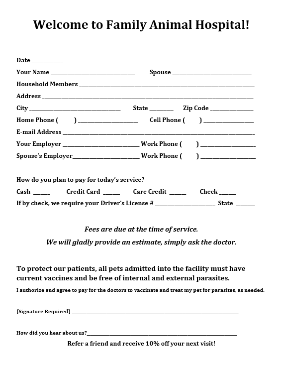 New clients will have to fill out paperwork for their pet. You can download copies of the forms here, print them out, then bring them to the clinic to make check-in quicker and easier.